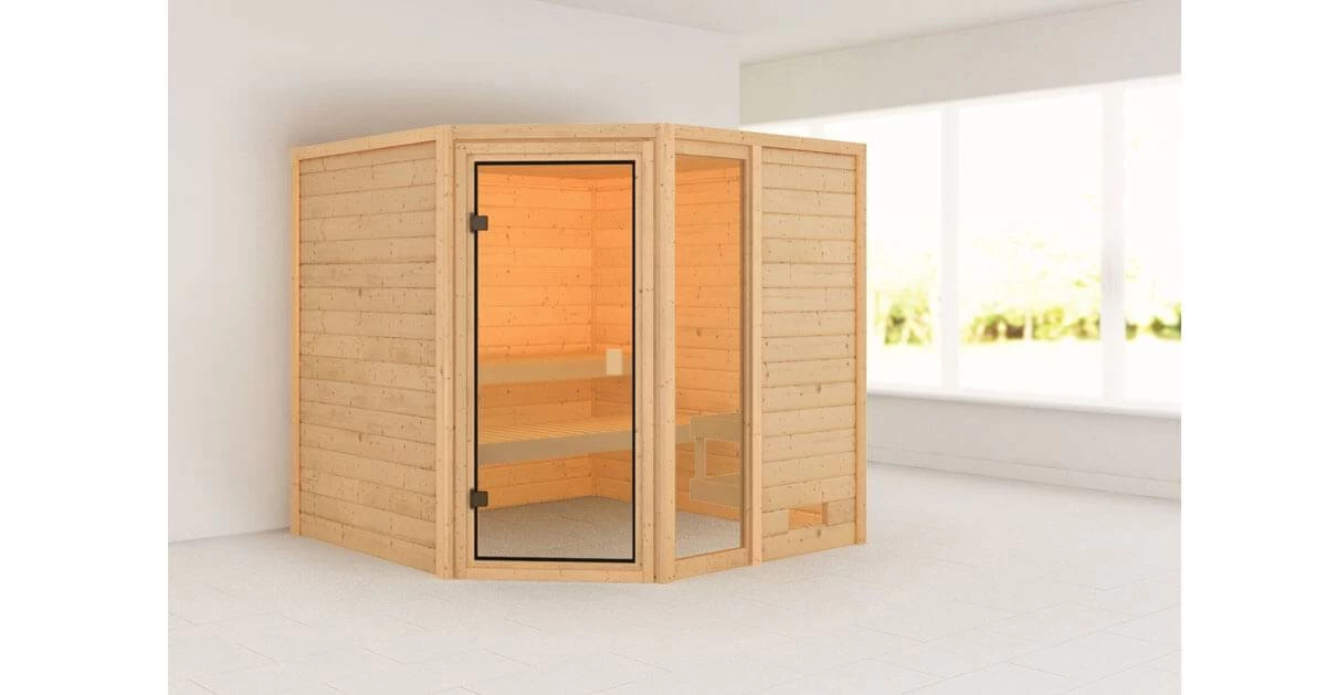 Was eignet sich für einen bislang ungenutzten Kellerraum besser, als eine eigene Sauna zum Entspannen und Wohlfühlen? Die Sauna Sauna Tabea hat ein Außenmaß von 196 x 196 cm und ist, aufgrund seiner geringen Höhe von 187 cm, ideal auch für Räume mit einer niedrigen Deckenhöhe geeignet. Die Massivholzsauna besteht aus 38mm starken Wandbohlen aus nordischer Fichte, welche im einfachen Steck- und Schraubsystem montiert werden. Durch den Eckeinstieg und die besondere, fünfeckige Form, sorgt die Sauna für ein Highlight in Ihrer Wellness-Oase. Mit einem optional wählbaren Dachkranz inkl. 3 LED-Spots, können Sie die Sauna von außen beleuchten und sie so gekonnt in Szene setzen. In den Innenraum gelangen Sie durch eine bronzierte Ganzglastür aus Einscheibensicherheitsglas. Damit beim Saunieren keine Wärme entweichen kann, wird die Tür durch eine Magnetverschlusstechnik geschlossen gehalten. Auf den, im Lieferumfang enthaltenen, Liegen können Sie den Saunagang so richtig genießen. Verschönern Sie das Ambiente in Ihrer Sauna und sorgen Sie für die größtmögliche Erholung mit unserem optional erhältlichen Zubehör. Eine Saunalampe Classic in der Ecke, eine ergonomische Kopfstütze für die perfekte Liegeposition oder eine Salzkristall Vital Sole für freies Atmen macht Ihren Saunagang zu einem perfekten Erlebnis. Entspannen Sie nach einem stressigen Arbeitstag und schöpfen Sie neue Kraft aus der angenehmen Wärme auf Ihrer Haut. Heizen Sie den Innenraum mit einem optional erhältlichen, klassischen 9kW-Ofen. Dieser sorgt aufgrund seiner höheren Leistung für höhere Temperaturen und für ein angenehmes Klima im Innenraum. Der Saunaofen ist in einer Variante mit integrierter Steuerung, einer mit externer Steuerung und als Bio-Kombiofen erhältlich. Nutzen Sie Ihren Kellerraum zur Entspannung und verwandeln Sie ihn in eine Wellness-Oase mit der Massivholzsauna Sauna Tabea.