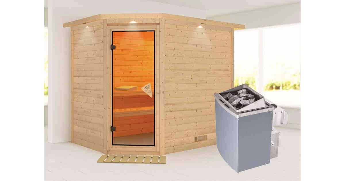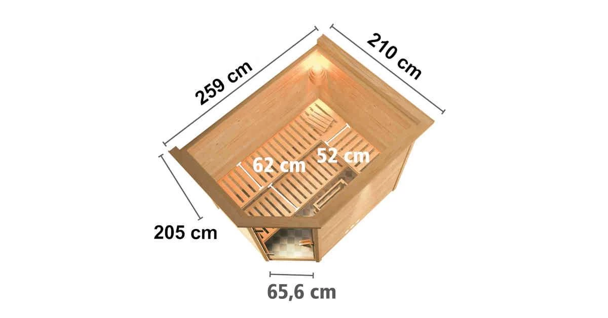 3 stabile Liegen aus Massivholz, 9kW Saunaofen mit integrierter Steuerung, Ofenschutzgitter, Montageanleitung