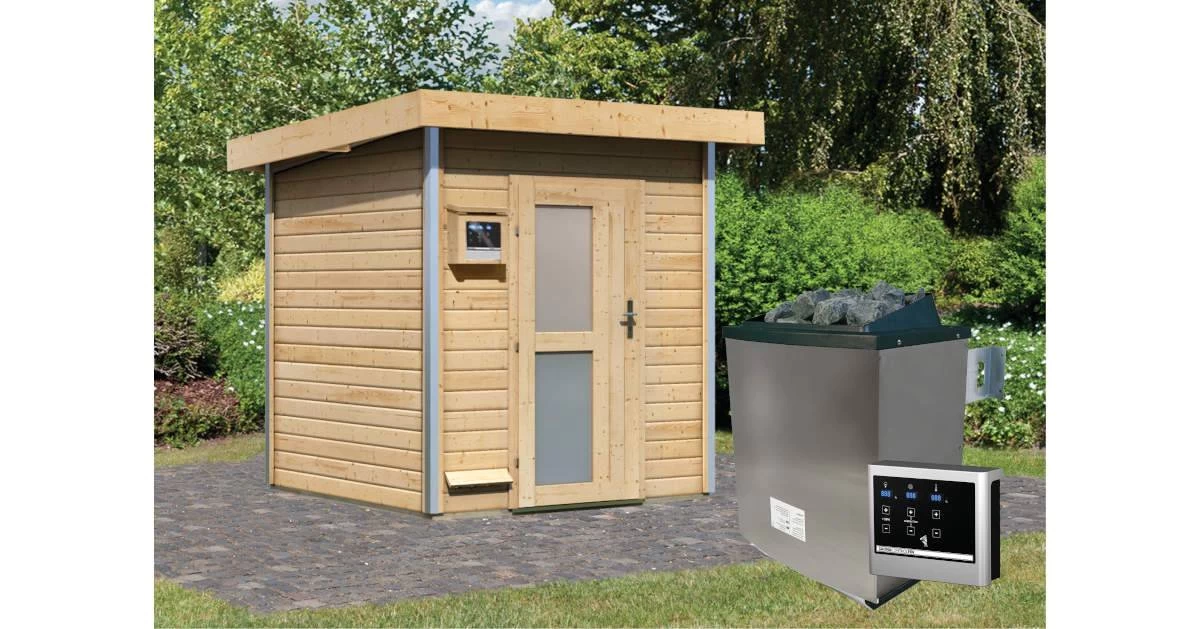 Das Saunahaus besteht aus 38mm Massivholzbohlen aus nordischem Fichtenholz und wird im einfachen Steck- und Schraubsystem montiert. Es ist in der modernen Farbe terragrau oder in dem klassischen naturbelassenen Holz erhältlich. Zum Schutz des Steuergerätes vor Nässe ist ein Steuergerät-Schutzkasten im Lieferumfang enthalten. Das schützende Pultdachhaus besteht aus Massivholz und bietet, ausgestattet mit einer optional erhältlichen selbstklebenden Dachfolie, den idealen Schutz vor der Witterung.