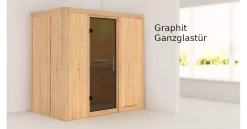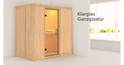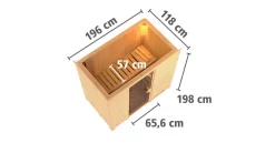 Sparen Sie wertvolle Energie mit der Systemsauna Variado. Eine 68mm starke Konstruktion, bestehend aus einer Rahmenkonstruktion mit 42 mm starker Mineraldämmwolle und einer Verkleidung an der Sichtseite aus 12,5 mm Spezial-Softline-Profilholz, hält die Wärme optimal im Saunainneren. Die Decke besteht aus einer 57 mm starken Spezialplatte mit Mineraldämmwolle. Die Außenmaße ohne Dachkranz betragen 196 x 118 x 198cm (B/T/H). Die Sauna verfügt über eine Saunabank aus Espenholz zum Entspannen und Wohlfühlen. Mit einem optional erhältlichen 9 kW-Saunaofen bringen Sie das Innere schnell auf Temperatur. Bei dem Ofen können Sie zwischen einer Variante mit integrierter Steuerung, einer Variante mit externer Steuerung oder einem 9 kW Bio-Kombiofen wählen. So ist garantiert für jeden das Richtige dabei. Durch einen optionalen Dachkranz inkl. drei LED-Spots können Sie Ihre Sauna von außen beleuchten und sie so perfekt in Szene setzen. In den Innenraum gelangen Sie durch eine Saunatür. Hier können Sie sich zwischen vier möglichen Varianten entscheiden. Egal ob klassisch mit bronziertem Glas, modern mit graphitfarbenem Glas, schlicht mit klarem Türglas oder passend mit einer energiesparenden, wärmegedämmten Holztür mit klarem Isolierglas. Durch die vorgefertigten Wand und Deckenelemente wird Ihnen ein einfacher Aufbau ermöglicht. Passen Sie die Sauna auf Ihre Bedürfnisse an mit unserem optional erhältlichen Zubehör. Eine ergonomische Kopfstütze für den optimalen Liegekomfort, eine ergonomische Rückenlehne zur perfekten Entspannung oder eine Saunaleuchte modern für das richtige Ambiente. Genießen Sie die Ruhe nach einem anstrengenden Arbeitstag bei einem ausgiebigen Saunagang und erholen Sie sich vom Alltag. Verringern Sie den Energieverbrauch beim Saunieren mit der 68 mm Systemsauna Variado