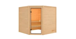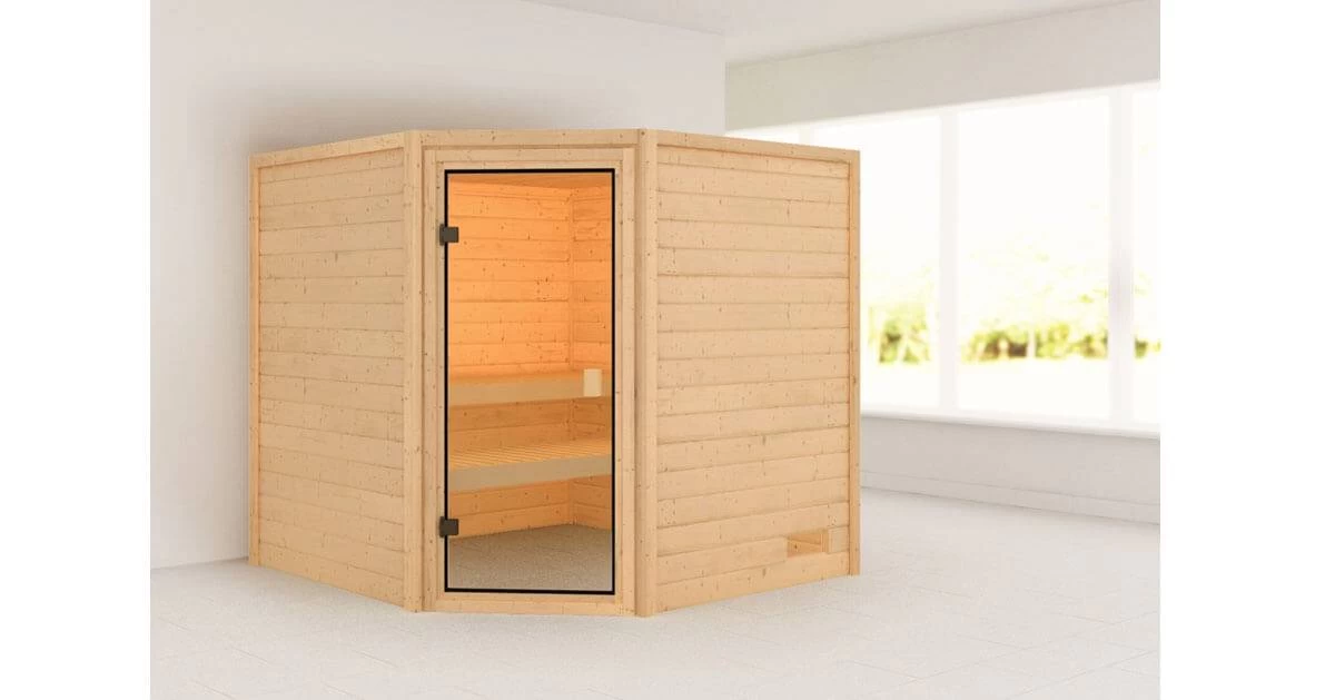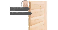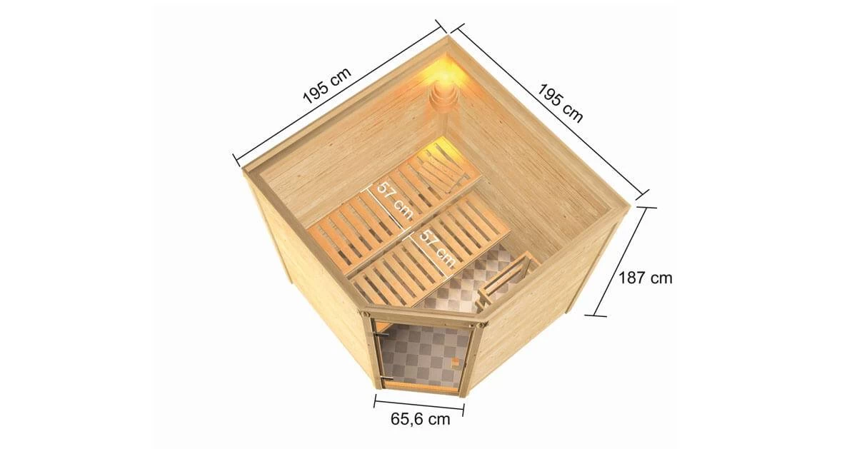 Diese Massivholzsauna aus 38 mm starken Massivholzbrettern aus hochwertiger nordischer Fichte wird im einfachen Steck-/Schraubsystem errichtet. Durch die hochwertige Saunatür mit Eckeinstieg gelangen Sie nach erfolgter Montage in den Innenraum mit 185 cm x 185 cm. Hier empfangen Sie das mitgelieferte Ofenschutzgitter sowie 2 Liege/n. Auch bei unseren Massivholzsaunen im Steck-/Schraubsystem sind alle 4 Seitenwände aus massivem Fichtenholz erstellt, sodass wir hier keinen Einsatz von Hartfaserplatten oder ähnlichem haben (außer im Dachbereich). Die Sauna mit den 4 Sichtseiten können so beliebig im Raum platziert werden. Die Dachplatten bestehen aus 57 mm Elementbauweise mit einer Mineralwolldämmung.