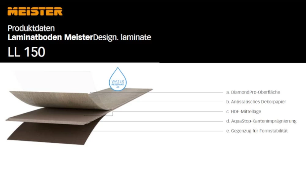 Robust, pflegeleicht, absolut im Trend und trotzdem zeitlos – mit dem MEISTER Laminat finden Sie den perfekten Mitbewohner. Laminat ist seit Jahren der am häufigsten verkaufte Hartbodenbelag und steht wie kein anderer für Pflegeleichtigkeit und Strapazierfähigkeit – und wurde und wird dabei ständig technisch und optisch weiterentwickelt. Ein rundum unkomplizierter Bodenbelag, der wenig Aufmerksamkeit benötigt und mit dem Sie einen schönen und widerstandsfähigen Boden über viele Jahre erhalten – garantiert. MEISTER-Laminat besteht zu 95 % aus natürlichen Rohstoffen, allen voran Holz: Das Herzstück bildet eine Platte aus hochverdichteten Holzfasern. Auf deren Unterseite befindet sich ein >> Gegenzug << zur Stabilisierung, auf der Oberseite das Dekorpapier, z.B. mit authentischen Holznachbildungen, Steindekoren oder ganz kreativen Designs. Die oberste Schicht (die Laufschicht) besteht aus widerstandsfähigem Melaminharz und verleiht dem Laminatboden seine enorme Strapazierfähigkeit und Pflegeleichtigkeit.