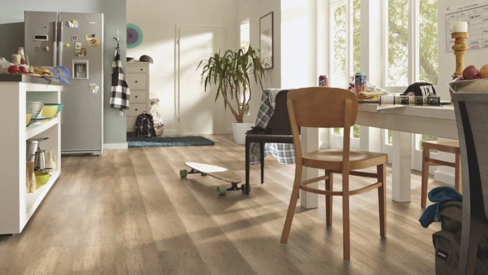 - Einfache und schnelle, leimlose Verlegung, auch auf Warmwasser-Fußbodenheizung