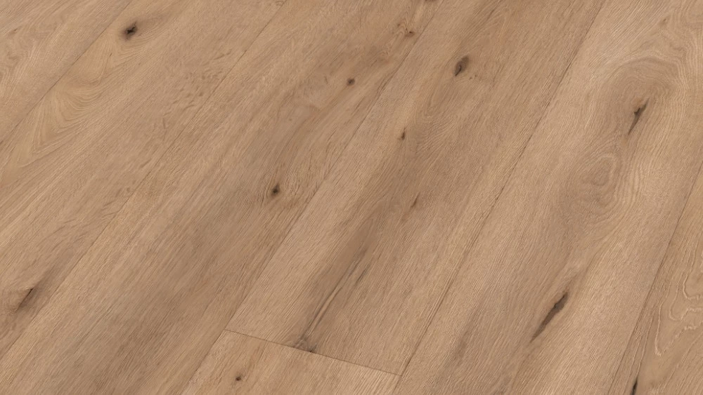 - Hohe Passgenauigkeit und hoher Verlegekomfort durch stabilen Dreischichtaufbau mit HDF-Mittellage