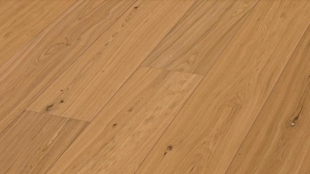 Für die Sortierung >natur< wählen wir Oberflächen mit einem ausgewogenen Farbspiel. Gesunde, festverwachsende Äste und vereinzelte Risse gehören zur natürlichen Gesamtwirkung des Bodens. Die Wood-Powder-Technologie sorgt für perfekt ausgebesserte Astausbrüche und Risse.