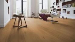 Für die Sortierung >natur< wählen wir Oberflächen mit einem ausgewogenen Farbspiel. Gesunde, festverwachsende Äste und vereinzelte Risse gehören zur natürlichen Gesamtwirkung des Bodens. Die Wood-Powder-Technologie sorgt für perfekt ausgebesserte Astausbrüche und Risse.