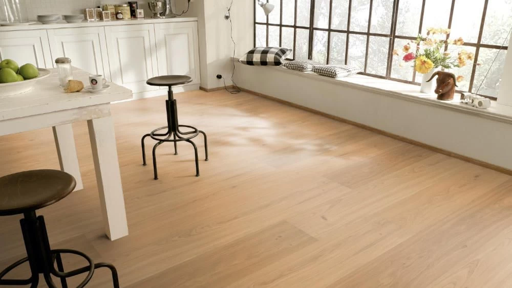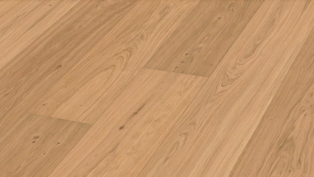 Für die Sortierung >natur< wählen wir Oberflächen mit einem ausgewogenen Farbspiel. Gesunde, festverwachsende Äste und vereinzelte Risse gehören zur natürlichen Gesamtwirkung des Bodens. Die Wood-Powder-Technologie sorgt für perfekt ausgebesserte Astausbrüche und Risse.