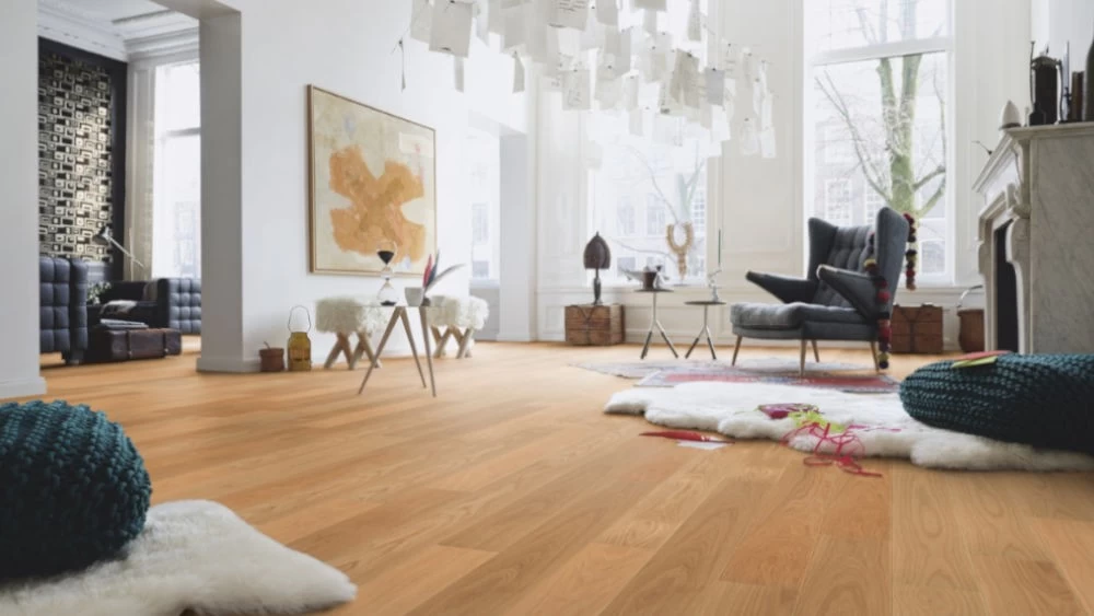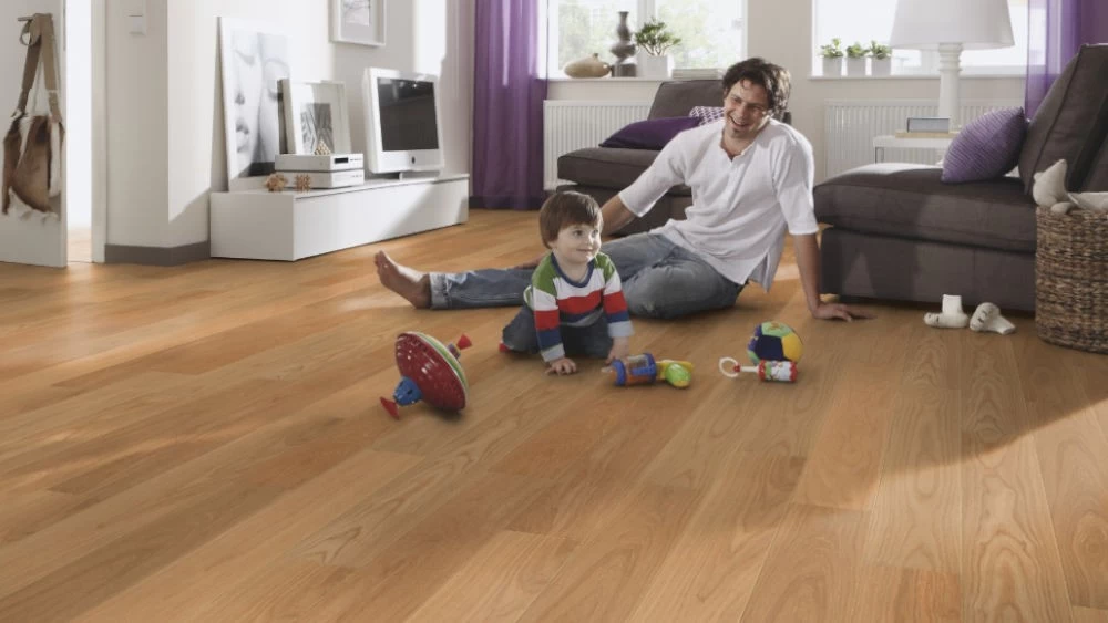Parkettsortierung harmonisch: Für die Sortierung >harmonisch< werden Edelhölzer mit ruhiger Optik sowie ausgewogenem und natürlichem farbspiel ausgewählt. Sie enthalten wenig fest verwachsene Ast- oder Braunkernanteile und keine Splintanteile. Bei der Kollektion PD450 können vereinzelte, fachmännisch ausgespachtelte Astausbrüche vorkommen.