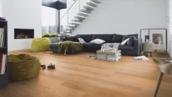Stabdielen oder Stabparkett im Maxi-Format liegen im Trend. Die Böden der Kollektion MeisterParkett. longlife PS 300 sind die perfekte Bodenlösung für kleinere Räume oder immer dann, wenn besondere Vielfalt auf dem Boden gefragt ist. Das Stabformat lässt sich in zwei unterschiedlichen Mustern verlegen: als englischer Verband (also immer versetzt um die Hälfte des Parkettstabes) oder sogenannter wilder Verband (willkürlich verlegt). Die umlaufende Microfuge hebt die einzelnen Parkettstäbe sichtbar voneinander ab und sorgt so für ein ganz plastisches Bodenerlebnis.