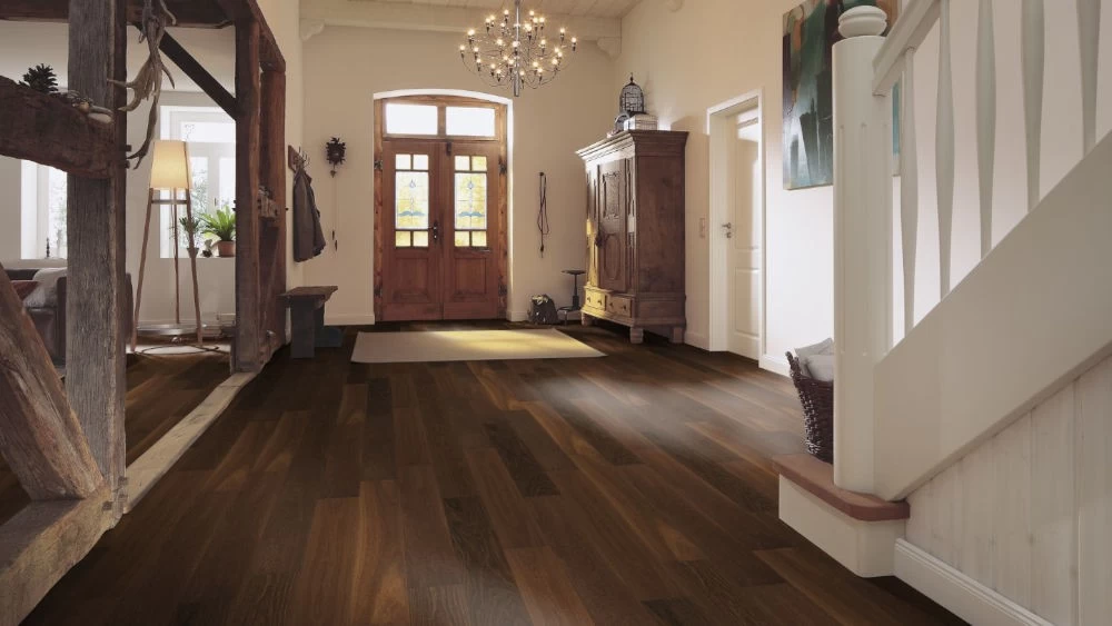 Parkettsortierung harmonisch: Für die Sortierung >harmonisch< werden Edelhölzer mit ruhiger Optik sowie ausgewogenem und natürlichem farbspiel ausgewählt. Sie enthalten wenig fest verwachsene Ast- oder Braunkernanteile und keine Splintanteile. Bei der Kollektion PD450 können vereinzelte, fachmännisch ausgespachtelte Astausbrüche vorkommen.