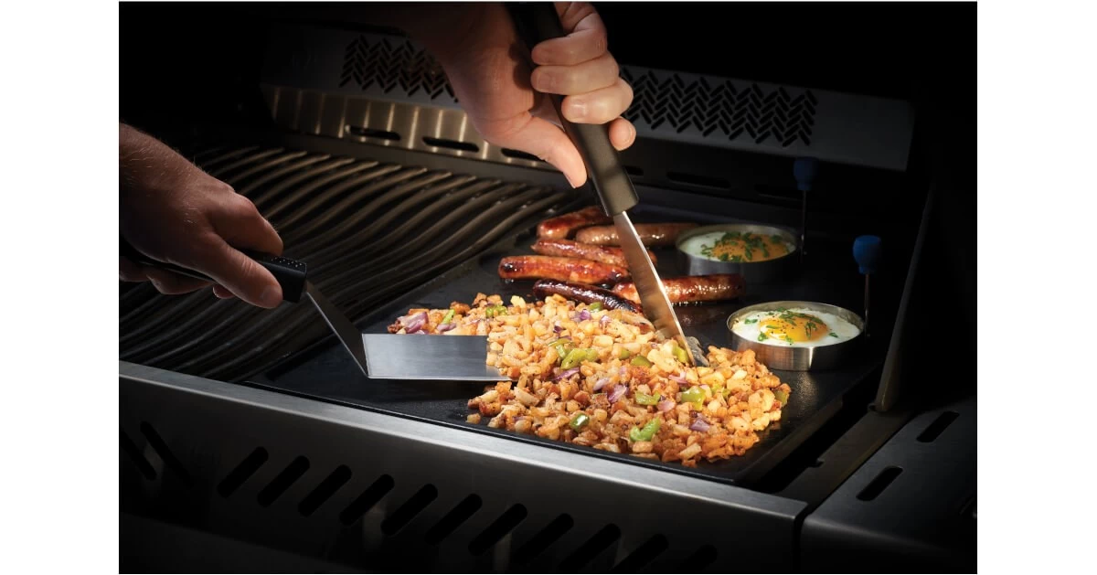 Napoleon® Set, bestehend aus vier Universalringen mit einem Innendurchmesser von 8,5cm. Mit Silikongriff. Ideal für Spiegeleier, als Form für Burger und vieles mehr. Die mitgelieferten Spatel bieten optimale Kontrolle auf einer Plancha.
