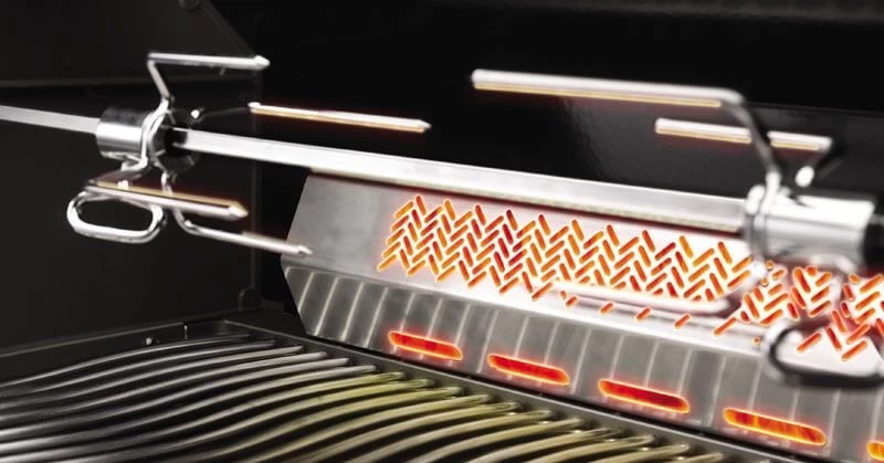 Steaks, Braten, Drehspieß und herkömmliche Grillgerichte finden bei 25,7 kW die jeweils optimale Grillzone: Vier Edelstahl-Rohrbrenner, einen Edelstahl-Infrarot-Heckbrenner für das mitgelieferte Drehspieß-Set und die innovative Infrarot SIZZLE ZONE™ mit höhenverstellbarem Edelstahl-Grillrost.