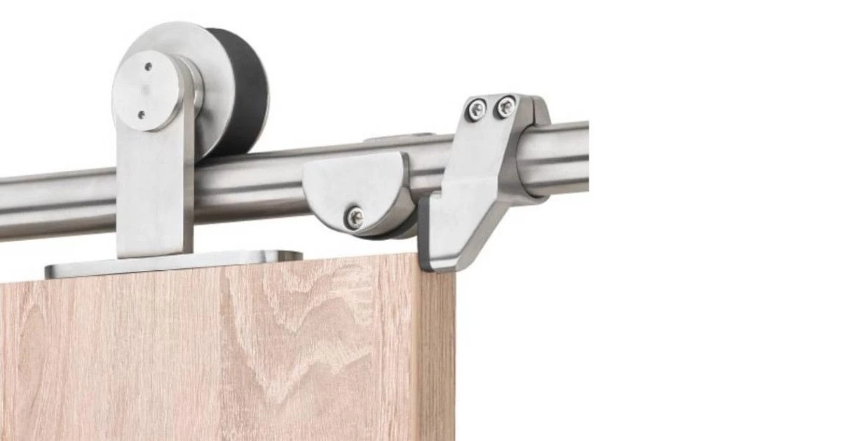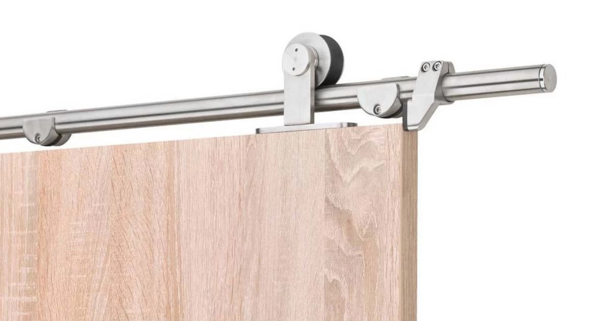 Ein Edelstahl-Schiebetürsystem mit sichtbar auf einem Rundrohr laufendem Rollwagen.