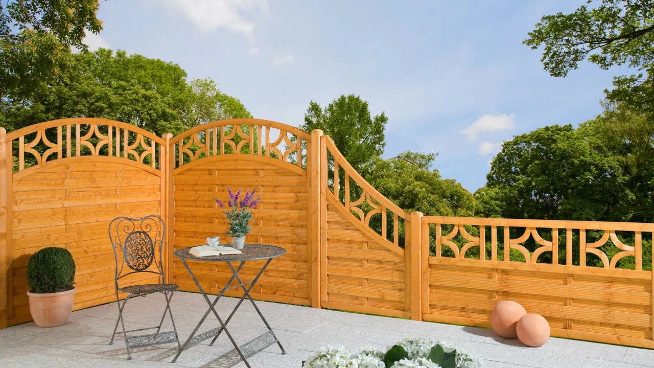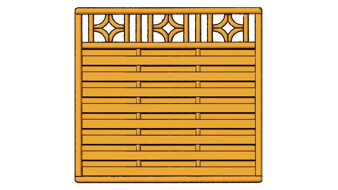 Sichtschutzzäune – Aktion, Zaunserie pinienfarbig lasiert, Kiefer/Fichte, Rahmen ca. 45 x 65 mm, Lamellen strukturgehobelt, edelstahlgeklammert und -verschraubt, ohne Pfosten (gegen Aufpreis erhältlich).