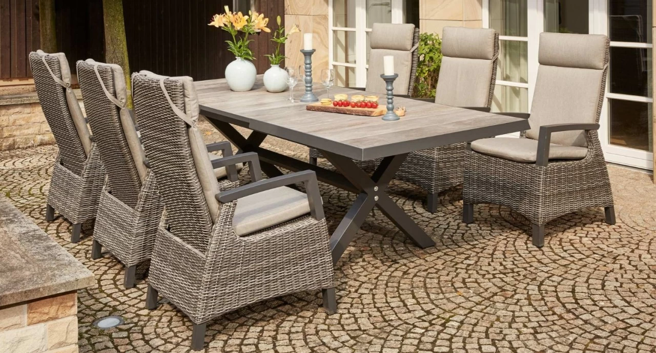 Komfort und Flexibilität werden bei diesem Dining-Set von SIENA GARDEN groĂźgeschrieben – verbringen Sie einzigartige Momente zusammen mit Freunden und Familie. Die moderne Tischgruppe besticht durch höchsten Sitzgenuss. Hier trifft Qualität auf schlichte Eleganz und viel Funktionalität: Die RĂĽckenlehne der bequemen Dining Sessel lässt sich stufenlos verstellen und der Ausziehtisch ist nicht nur optisch ein Highlight, sondern lässt sich ganz nach Bedarf vergrößern. Holen Sie sich mit diesem Dining-Set eine Extraportion Komfort in Ihren Garten.