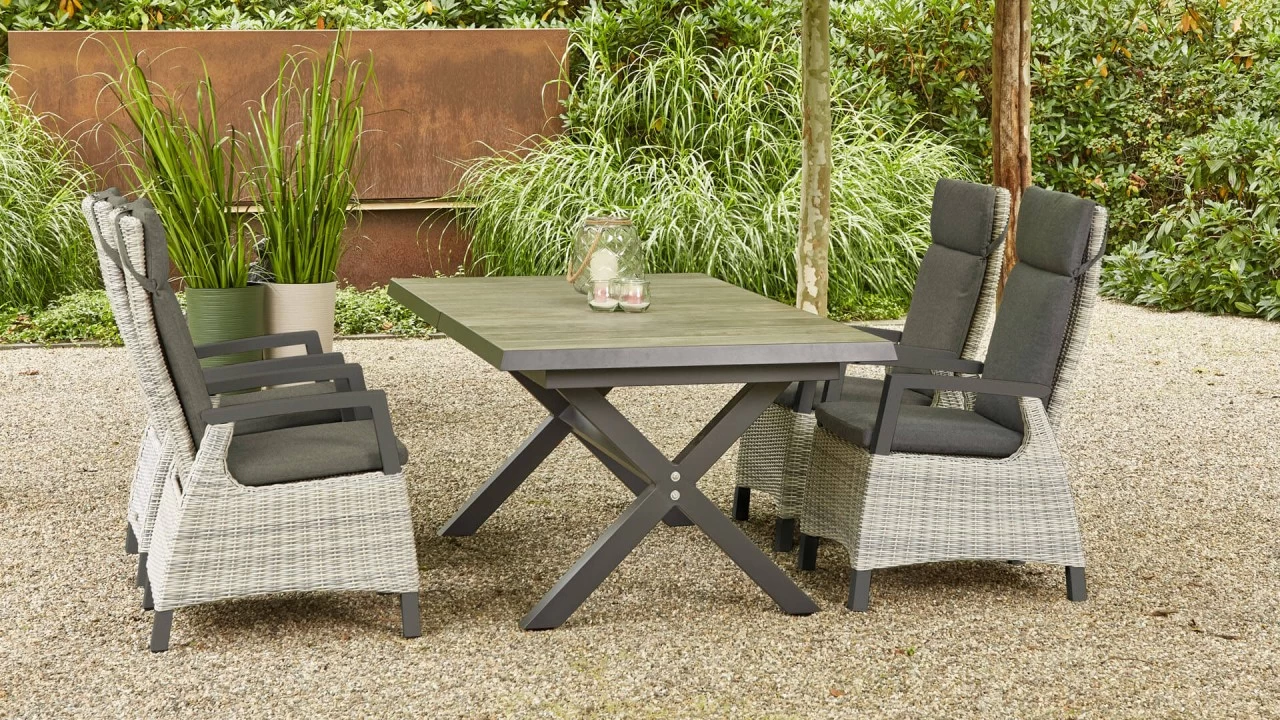 Freuen Sie sich auf gemeinsame Grillabende und gemütliches Beisammensein mit Ihren Lieben. Diese Tischgruppe macht es möglich und lädt Sie und Ihre Gäste jederzeit zum Zurücklehnen und Verweilen ein. Das wetterfeste und pflegeleichte Dining-Set bietet bequem bis zu 4 Personen Platz. Sie erhalten den Ausziehtisch Sincro mit rechteckiger Tischplatte und 4 bequeme Dining Sessel Corido. Stellen Sie die Rückenlehne des Anpassungskünstlers ganz einfach über einen Knopf in der Armlehne stufenlos ein. Die verbesserte Movetechnik sorgt für eine sanft laufende Rückenlehne, die müheloses Entspannen ermöglicht. Jeder Sessel hat ein Gesamtmaß von ca. 76 x 62 x 109 cm. Die ca. 50 cm breite Sitzfläche ist großzügig bemessen und bietet ein tolles Sitzgefühl. Mit einer Sitztiefe von ca. 48 cm und bei einer Sitzhöhe von ca. 44 cm lässt es sich hier auch herrlich bei einem Nickerchen entschleunigen. Das Gestell und die praktischen Armlehnen aus Aluminium schwarz in einer Höhe von ca. 64 cm bieten zusätzlichen Komfort. Passende Sitzpolster in der Trendfarbe anthrazit meliert verleihen den Sitzmöbeln ein unvergleichliches Sitzerlebnis.