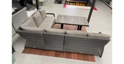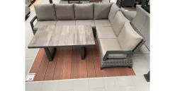 Die 5 teilige Eck-Loungegarnitur Corido bietet Ihnen den perfekten mix aus gemütlichkeit der Loungegruppe und dem nutzen von Dining Gartenmöbeln. Durch die Sitzhöhe ist das Essen besonders bequem möglich. Nach dem Essen lädt die Corido-Ecklounge zur Entspannung ein. Aufgrund der Größe ist die Sitzgruppe ideal für Nutzung mit der ganzen Familie und Freunden geeignet. Die Dining Lounge besteht aus einem Eckteil, einem Mittelteil und 2 2-Sitzer Loungebänken inkl. 11 Sitz- und Rückenkissen, sowie einem Loungetisch mit den Maßen 140 x 85 x 65 cm. Die Platte besteht aus besonders pflegeleichter und widerstandfähiger Keramik.