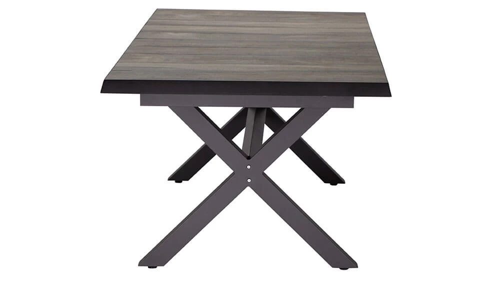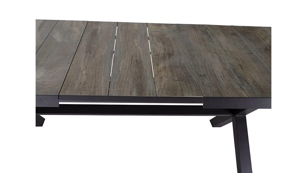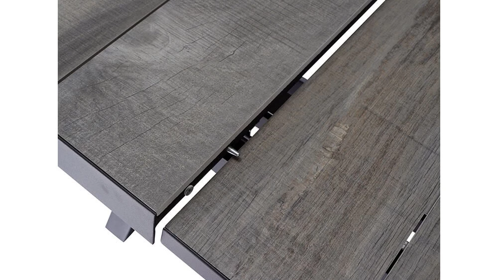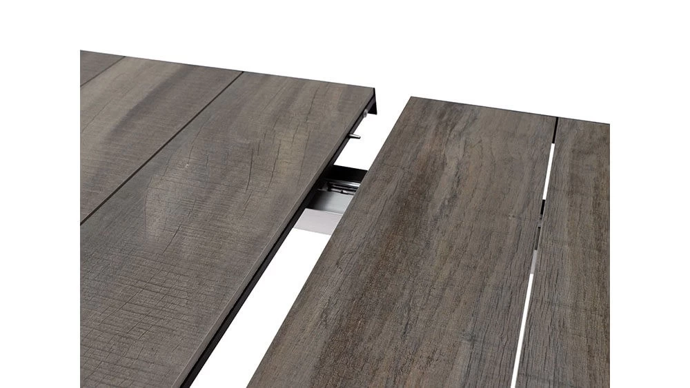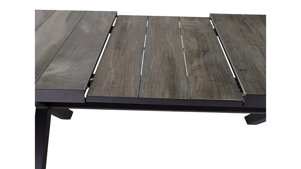Wer das Besondere liebt und gerne auf jede Gelegenheit vorbereitet sein möchte, ist mit diesem ausziehbaren Automatik-Esstisch bestens bedient. Der Tisch ist ca. 100 cm breit und ca. 77 cm hoch, im normalen Zustand hat er eine Länge von ca. 200 cm – so steht dem gemĂĽtlichen Mittagessen mit der Familie nichts mehr im Wege. Das Gestell wurde aus pulverbeschichtetem Aluminium in Anthrazit hergestellt, was den Tisch besonders haltbar macht. Die Tischplatte besteht aus hochwertigem Keramik in graubrauner Holzoptik. Die Platte zum Erweitern des Tisches ist ebenfalls aus Keramik gefertigt und lässt sich ganz einfach ausziehen. Man zieht einfach die beiden oberen Platten auseinander und die darunterliegende Keramikplatte schwenkt aufgrund der Automatikfunktion nach oben, und schon ist der Tisch auf ca. 260 cm erweitert – perfekt fĂĽr spontane, groĂźe Runden. Die Unterschubhöhe beträgt ca. 68 cm – so kann man gemĂĽtlich mit vielen Arten von Sesseln an diesem Tisch Platz nehmen. Der Tisch hat ein Gewicht von ca. 93,5 kg, und ist somit perfekt gegen Windstöße geschĂĽtzt. Die FuĂźkappen bestehen aus schwarzem Kunststoff und schĂĽtzen den Boden vor unschönen Kratzern beim VerrĂĽcken des MöbelstĂĽcks.