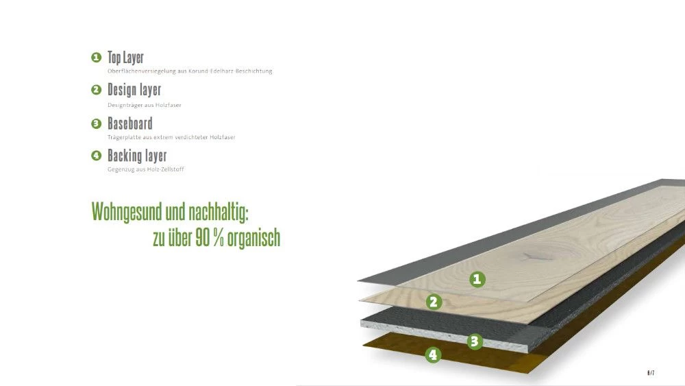 Holz und Feuchte vertragen sich normalerweise nicht gut. Mit Dureco wird diese Grenze ganz einfach überwunden. Möglich wird das durch die sogenannte SEAL Technologie. Dabei handelt es sich um eine Kombination aus verschiedenen Leistungskomponenten, die gemeinsam im Verbund einen wirksamen Schutz aufbauen. SEAL hindert stehendes Wasser daran in den Boden einzudringen – und das bis zu 24 Stunden. Mit Dureco lebst du jederzeit entspannt. Zudem nachhaltig und wohngesund. Somit vereint der dureco Boden zwei entgegengesetzte Pole. Auf der einen Seite ist er nahezu vollständig aus Holz. Auf der anderen Seite wehrt er Wasser sehr beständig ab.