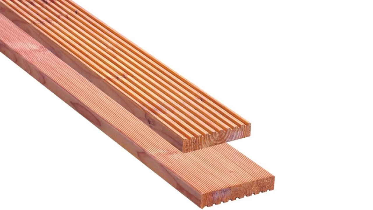Hochwertige Terrassendiele aus naturbelassenem Douglasien-Holz. Eine Seite grob geriffelt, die andere Seite fein geriffelt.