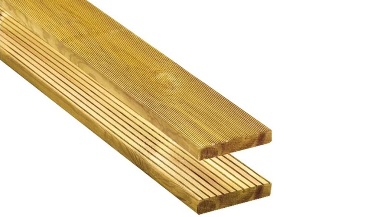 Klassische Terrassendiele aus kesseldruckimprägniertem Kiefern-/Fichten-Holz. Die eine Seite fein geriffelt, die andere Seite grob geriffelt.