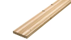 Klassische Terrassendiele aus Lärchen-Holz. Die eine Seite grob geriffelt, die andere Seite semi-geriffelt.