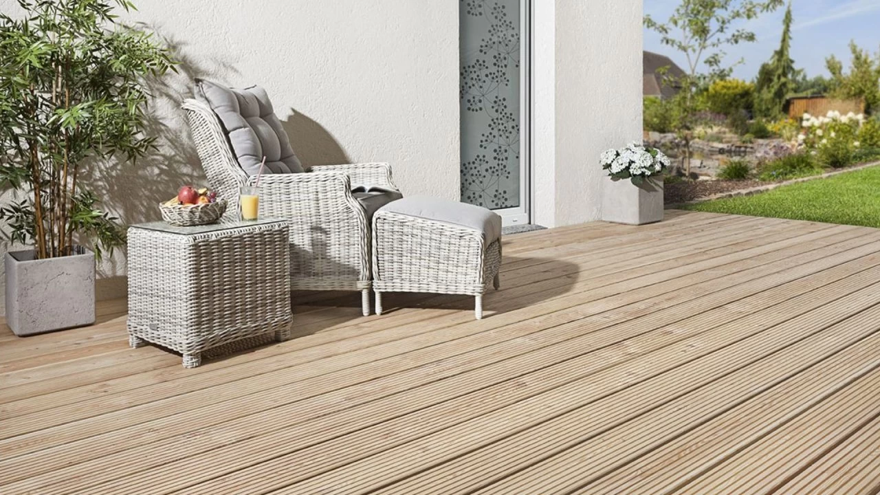 Die Terrassendiele ist aus sibirischer Lärche gefertigt und naturbelassen. Sie ist auf der einen Seite 7-fach genutet