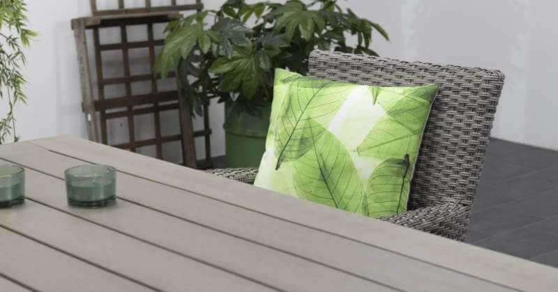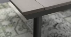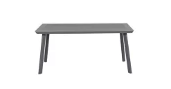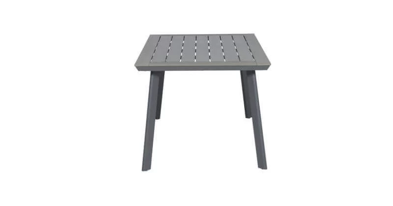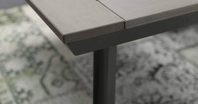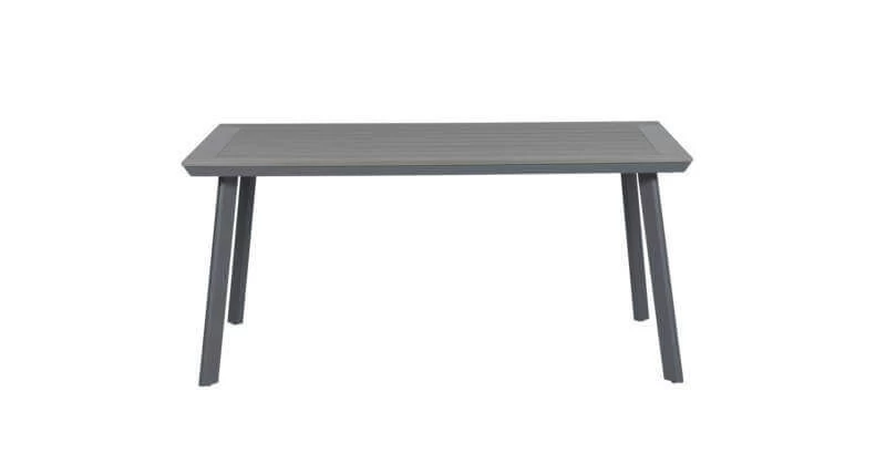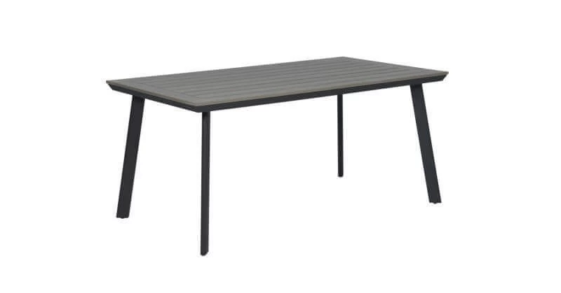 Der Tisch hat ein Aluminiumgestell mit einer Pulverbeschichtung. Aluminium hat viele Vorteile, zum Beispiel ist es rostfrei und pflegeleicht. Bei der Tischplatte handelt es sich um eine Polywood-Platte in der Farbe carbon grey.