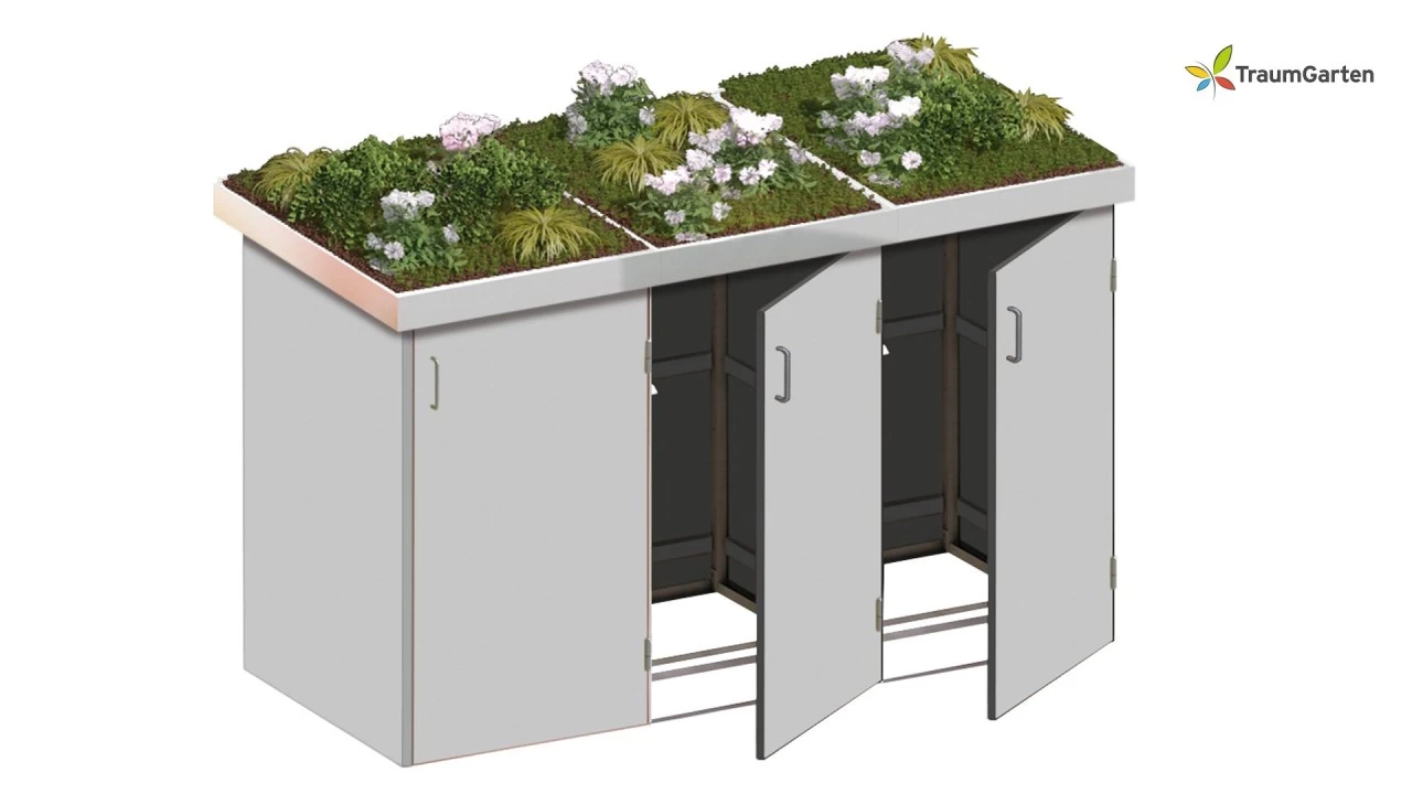 Das Binto Mülltonnensystem von Brügmann Traumgarten bietet Ihnen die Möglichkeit Ihre Mülltonnen praktisch und attraktiv zu verbergen. Diese 3er Binto Mülltonenbox ist ausgestattet mit einer HPL Verkleidung und einer praktischen Pflanzschale. Um Ihren individuellen Platzverhältnissen gerecht zu werden, lassen sich die Tür der Binto-Mülltonnenboxen DIN links und DIN rechts anschlagen.