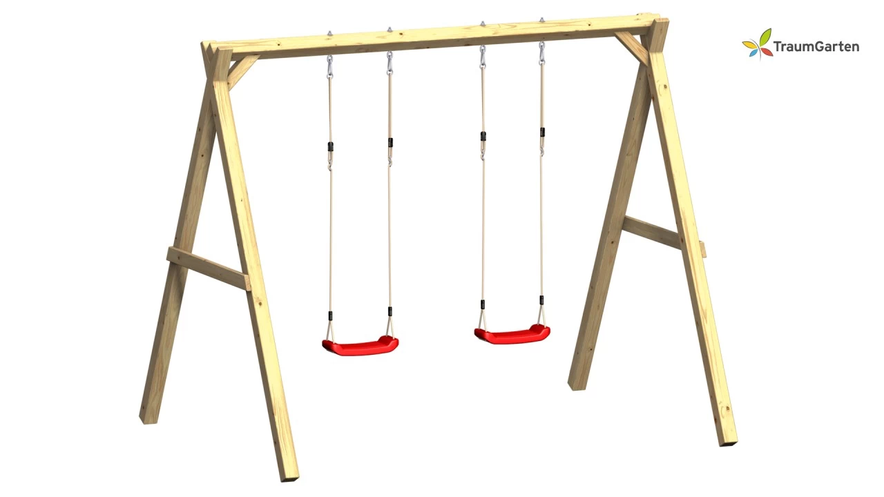 Die FIPS Doppelschaukel aus massivem, FSC® zertifiziertem Nadelholz ist ein Komplettset inklusive zweier Kunststoffschaukeln. Der stabile Schaukelbalken wird um 45° gedreht verbaut, um den maximalen Durchmesser des Kantholzes von 12 cm zu erreichen.