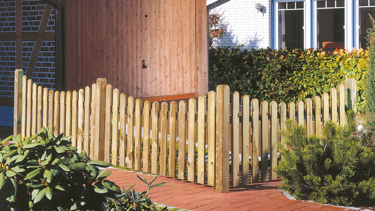 Vorgartenzäune – Aktion, Zaunserie Element 884171, Kiefer/Fichte kesseldruckimprägniert, MaĂź ca. B 180 x H 71/85 cm, Staketen ca. 19 x 90 mm, Köpfe gerundet, edelstahlgenagelt, ohne Pfosten (gegen Aufpreis erhältlich).