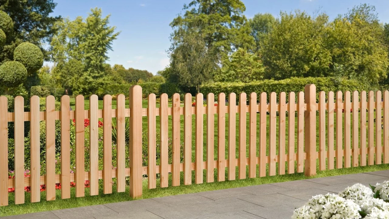 Vorgartenzäune – Aktion, Zaunserie Element 884855, Lärche naturbelassen, MaĂź ca. B 180 x H 80 cm, extra starke Staketen ca. 25 x 70 mm, mit gerundeten Köpfen, edelstahlgenagelt, ohne Pfosten (gegen Aufpreis erhältlich).
