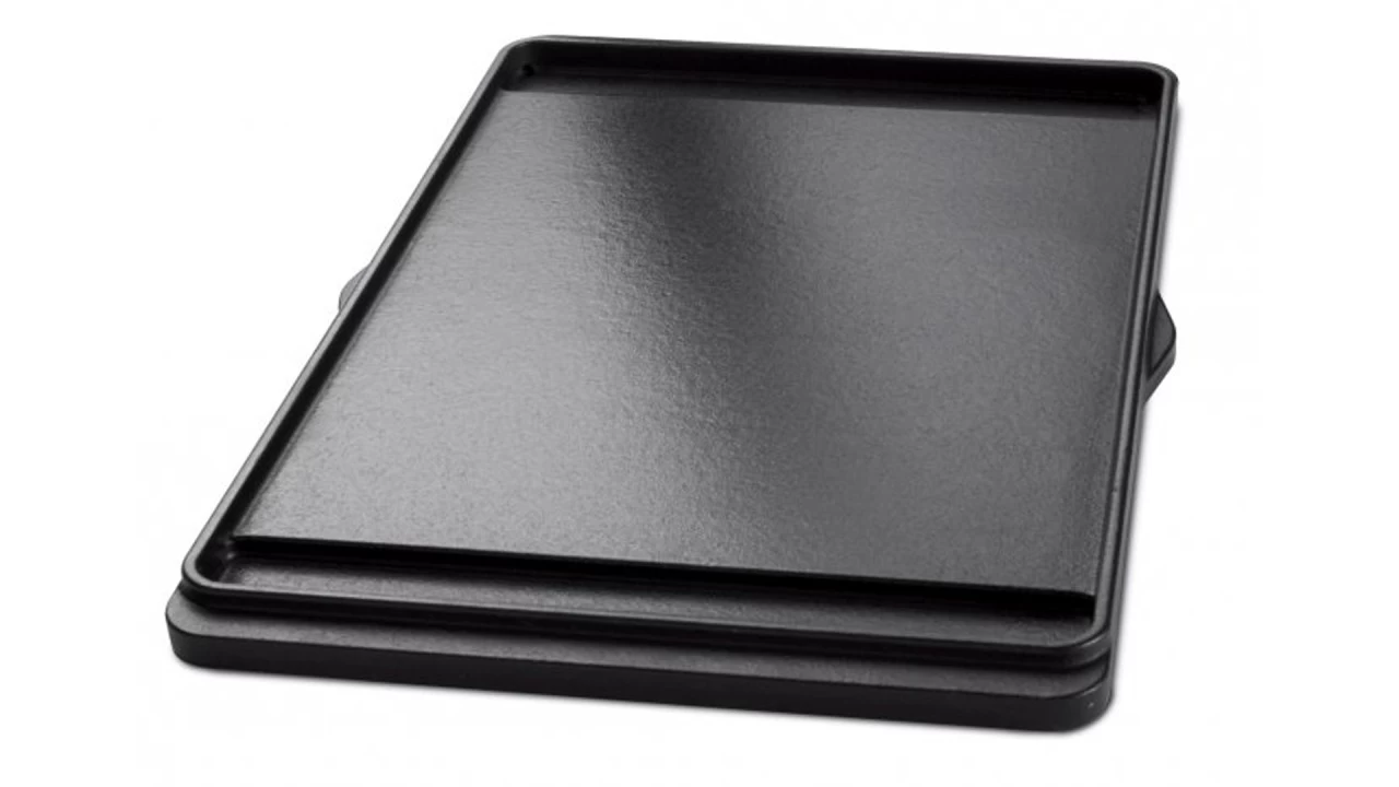 Die gusseiserne Wendeplatte ist beidseitig nutzbar. Sie ist mit einer flachen und einer geriffelten Seiten ausgestattet. Ersetzt den Grillrost.