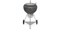 Der in limitierter Auflage erhältliche 70th Anniversary Edition Kettle Holzkohlegrill von Weber ist ein hochwertiger Kugelgrill, bei dem nostalgische und moderne Features kombiniert sind. In seinem durchdachten Äußeren finden sich Reminiszenzen an verschiedene Phasen aus der Geschichte von Weber. Handemailliertes Hollywood-Grau erinnert an klassische Filme aus den 1950er-Jahren, in denen der Kugelgrill entstand. Weitere Retro-Merkmale sind eine robuste Ablageschale zum Aufbewahren, ein Deckelthermometer mit 50er-Jahre-Motiv, Räder mit Weißwandreifen und Nylongriffe mit Holzoptik. Alles zusammen ergibt ein Grillerlebnis, das zum Feiern einlädt.