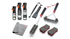 Das Reinigungsset besteht aus einer dreiseitigen GrillbĂĽrste, einem Grillrost-Reiniger, Reinigungsschwamm (2 Stk.), einem Grillkammerschaber, einer Insektengitter-BĂĽrste, einer GrillbĂĽrste fĂĽr die Brenner, einem Non-Stick Spray, einem Edelstahl-Reiniger und einem Mikrofasertuch.