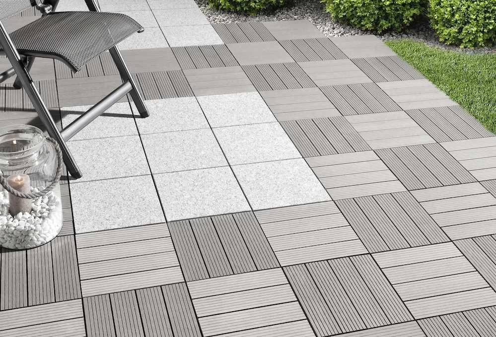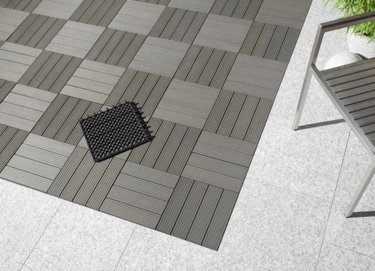 WPC-Fliese in den Maßen 30 x 30 cm auf Kunststoffgitter. Deckleisten aus Holzwerkstoff (Holz-Kunststoff-Gemisch). Materialstärke: 22 mm. Abgabe nur im 6er-Pack (0,54m² pro Paket).